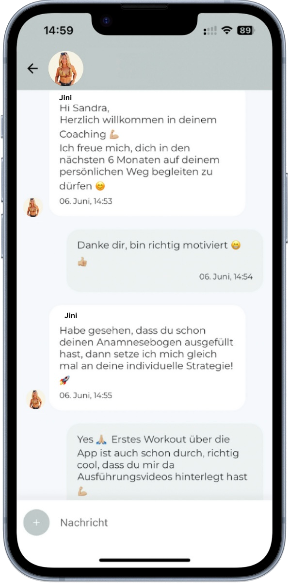 Ich bin immer für dich da! Ob Check-ins oder Motivation – ich unterstütze dich im Chat, wenn du mich brauchst.